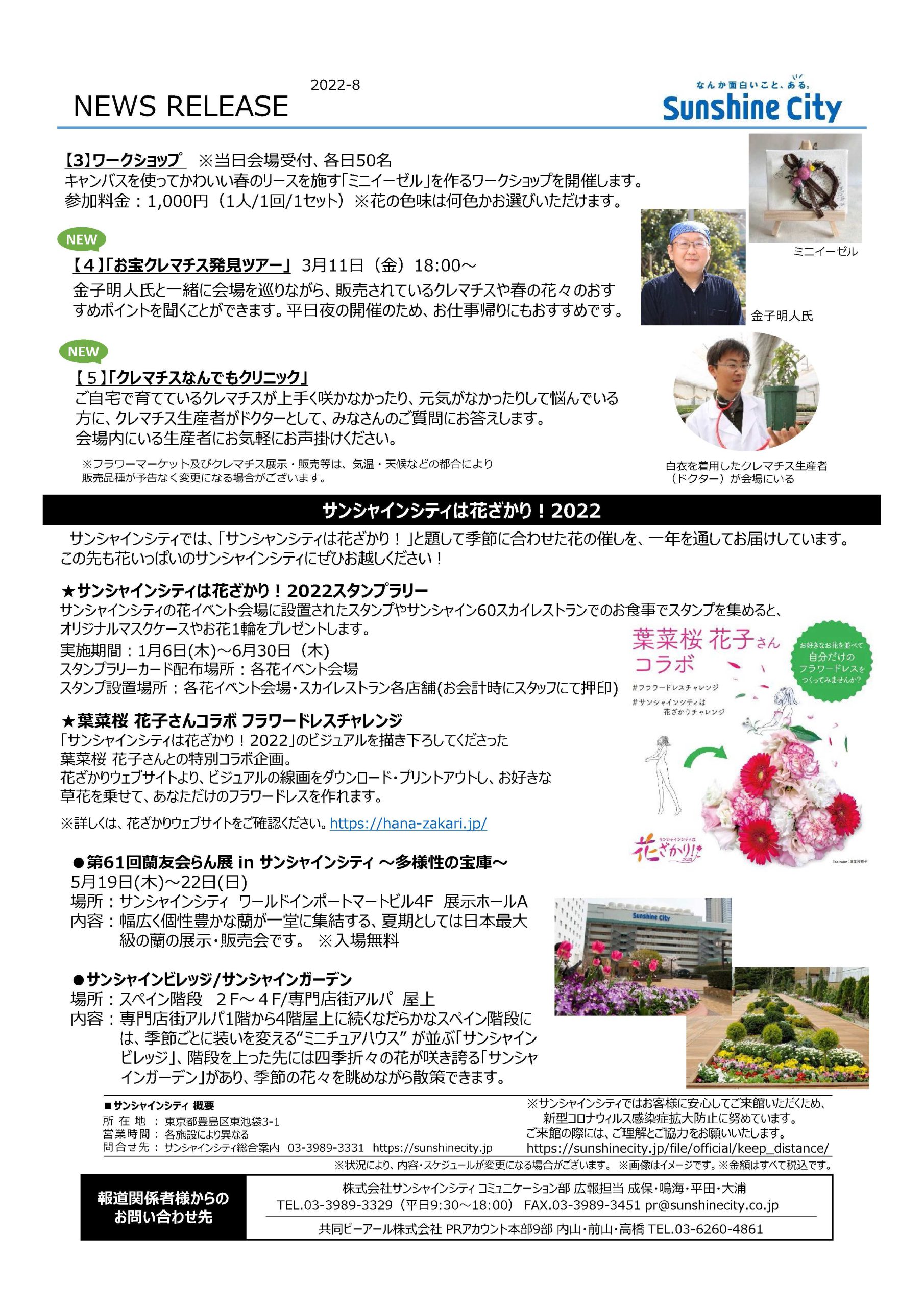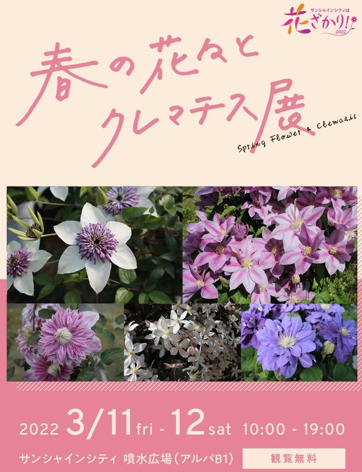 サンシャインシティ(東京・池袋)では、「サンシャインシティは花ざかり!2022」のイベントのひとつとして3月11日(金)~12日(土)の期間、気品と華やかさをもつ約150品種のクレマチスが勢ぞろいする「春の花々とクレマチス展」をサンシャインシティ 噴水広場(専門店街アルパ B1)で開催します。